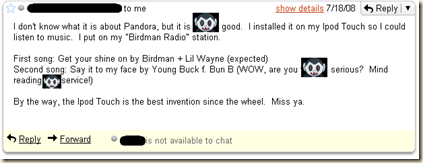 We had a lot of fun. We both went on the Tilt-A-Whirl, the pendulum-thingy that they called 1001Nachts (there was this girl that sat next to us and kicked two little kids off - who had, in all fairness, just ridden - so that her boyfriend could get on the ride. He had some nice shiny grills in his mouth; I was a little jealous.), and that ride that flipped upside-down; it's called the Energy Storm. That ride was terrifying! I was slipping all over the seat, my head flew out sideways and I couldn't bring it back in. And to make it worse, being upside down that long made my head start to itch. Can't scratch it - still have cornrows! Mr. Trizzle also went on the Gravitron to use up the last four tickets, while I got a snow cone.